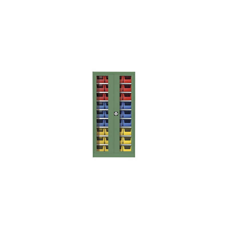 Armadio con ante a battente con finestrella, con 36 cassettine, verde reseda. Fornitura = montato. Altezza = 1950 mm. Larghezza = 950 mm. Profondità = 420 mm. Struttura = saldata. Materiale = acciaio. Superficie = verniciatura a polvere. Numero ripiani = 8 pz. Materiale ripiani = zincato. Portata per ripiano = 80 kg. Passo di regolazione altezza ripiani = 35 mm. Cassettine numero / lungh. x largh. x alt. = 12 x blu / 350x210x140 mm, 12 x giallo / 350x210x140 mm, 12 x rosso / 350x210x140 mm. Colore corpo = verde reseda RAL 6011. Colore porta = verde reseda RAL 6011. Tipo di porta = ante a battente con finestrella. Serratura = serratura a cilindro girevole con chiusura a triplo chiavistello, 2 chiavi incluse. Numero cassette = 36 pz. Peso = 79.12 kg. Contenuto dell'armadio ben visibile per non rimanere senza scorte. Grazie alla grande finestrella robusta, si ha una panoramica completa del materiale a disposizione che resta tuttavia al sicuro sotto chiave! Corpo Robusto corpo in