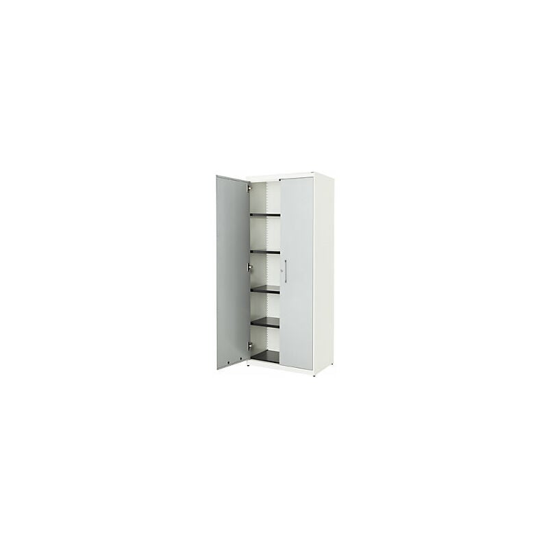 Armadio con ante a battente, alt. x largh. 1956 x 800 mm, pannello in acciaio, 4 ripiani, bianco puro / alluminio brillante / bianco puro. Fornitura = montato. Larghezza = 800 mm. Altezza = 1956 mm. Profondità = 432 mm. Colore corpo = bianco puro RAL 9010. Materiale = acciaio, verniciato a polvere. Tipo di prodotto = armadi con ante a battente. Tipo di porta = anta a battente. Colore porta = alluminio brillante RAL 9006. Numero ante = 2 pz. Numero ripiani = 4 pz. Materiale ripiani = acciaio, verniciato a polvere. Colore ripiani = nero grafite RAL 9011. Portata per ripiano = 44 kg. Caratteristiche = con serratura. Serratura = serratura a cilindro girevole con chiusura a triplo chiavistello, 2 chiavi incluse. Numero file raccoglitori = 5 pz. Dotazione interna = 4 ripiani. Angolo di apertura delle porte = 120 °. Semplice spazio per raccoglitori, documenti e materiale da ufficio. Il modello classico tra gli armadi archivio. Design minimalista. Funzionalità pratica. Corpo: robusto corpo in