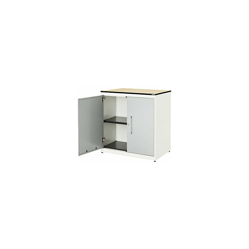 Armadio con ante a battente, alt. x largh. 818 x 800 mm, piano in HPL con anima piena, 1 ripiano, bianco puro / alluminio brillante / acero. Fornitura = montato. Larghezza = 800 mm. Altezza = 818 mm. Profondità = 432 mm. Colore corpo = bianco puro RAL 9010. Materiale = acciaio, verniciato a polvere. Tipo di prodotto = armadi con ante a battente. Tipo di porta = anta a battente. Colore porta = alluminio brillante RAL 9006. Numero ante = 2 pz. Numero ripiani = 1 pz. Materiale ripiani = acciaio, verniciato a polvere. Colore ripiani = nero grafite RAL 9011. Portata per ripiano = 44 kg. Caratteristiche = con serratura. Serratura = serratura a cilindro girevole con chiusura a triplo chiavistello, 2 chiavi incluse. Numero file raccoglitori = 2 pz. Dotazione interna = 1 ripiano. Angolo di apertura delle porte = 120 °. Semplice spazio per raccoglitori, documenti e materiale da ufficio. Il modello classico tra gli armadi archivio. Design minimalista. Funzionalità pratica. Corpo: robusto corpo in
