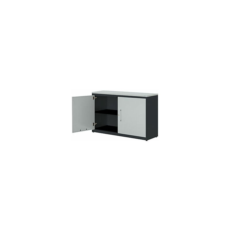Armadio con ante a battente, alt. x largh. 830 x 1200 mm, pannello in plastica, 1 ripiano, grigio antracite / grigio chiaro / grigio chiaro. Fornitura = montato. Larghezza = 1200 mm. Altezza = 830 mm. Profondità = 432 mm. Colore corpo = grigio antracite RAL 7016. Materiale = acciaio, verniciato a polvere. Tipo di prodotto = armadi con ante a battente. Tipo di porta = anta a battente. Colore porta = grigio chiaro RAL 7035. Numero ante = 2 pz. Numero ripiani = 1 pz. Materiale ripiani = acciaio, verniciato a polvere. Colore ripiani = nero grafite RAL 9011. Portata per ripiano = 66 kg. Caratteristiche = con serratura. Serratura = serratura a cilindro girevole con chiusura a triplo chiavistello, 2 chiavi incluse. Numero file raccoglitori = 2 pz. Dotazione interna = 1 ripiano. Angolo di apertura delle porte = 120 °. Semplice spazio per raccoglitori, documenti e materiale da ufficio. Il modello classico tra gli armadi archivio. Design minimalista. Funzionalità pratica. Corpo: robusto corpo in