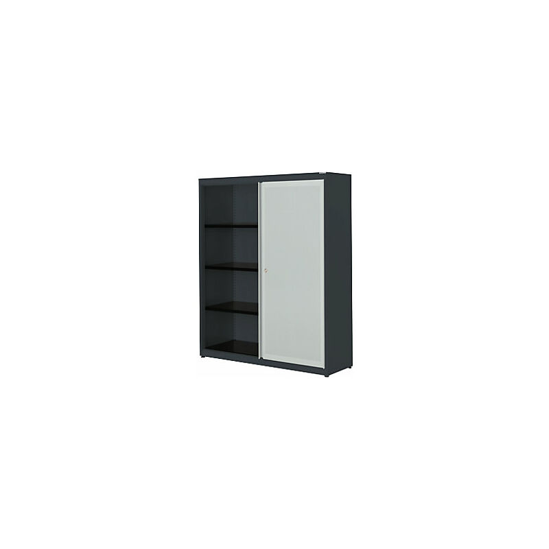 Armadio con ante scorrevoli, con efficace assorbimento acustico, pannello in acciaio, alt. x largh. x prof. 1516 x 1200 x 432 mm, 3 ripiani, grigio antracite / grigio chiaro / grigio antracite. Fornitura = montato. Larghezza = 1200 mm. Altezza = 1516 mm. Profondità = 432 mm. Colore corpo = grigio antracite RAL 7016. Materiale = acciaio, verniciato a polvere. Tipo di prodotto = armadi con ante scorrevoli. Tipo di porta = porta scorrevole. Colore porta = grigio chiaro RAL 7035. Numero ante = 2 pz. Numero ripiani = 3 pz. Colore ripiani = nero grafite RAL 9011. Portata per ripiano = 66 kg. Caratteristiche = con serratura. Serratura = serratura a cilindro girevole con nucleo sostituibile, 2 chiavi incluse. Numero file raccoglitori = 4 pz. Dotazione interna = 3 ripiani. Versione salvaspazio con ante agevolmente scorrevoli. Se nell'ufficio prevalgono aree di transito molto strette, si consiglia l'utilizzo di questo armadio. Qui nessuna anta aperta ingombrerà il passaggio. Ideale per piano