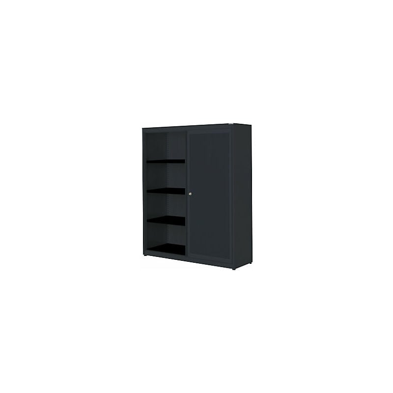 Armadio con ante scorrevoli, con efficace assorbimento acustico, pannello in acciaio, alt. x largh. x prof. 1516 x 1200 x 432 mm, 3 ripiani, grigio antracite / grigio antracite / grigio antracite. Fornitura = montato. Larghezza = 1200 mm. Altezza = 1516 mm. Profondità = 432 mm. Colore corpo = grigio antracite RAL 7016. Materiale = acciaio, verniciato a polvere. Tipo di prodotto = armadi con ante scorrevoli. Tipo di porta = porta scorrevole. Colore porta = grigio antracite RAL 7016. Numero ante = 2 pz. Numero ripiani = 3 pz. Colore ripiani = nero grafite RAL 9011. Portata per ripiano = 66 kg. Caratteristiche = con serratura. Serratura = serratura a cilindro girevole con nucleo sostituibile, 2 chiavi incluse. Numero file raccoglitori = 4 pz. Dotazione interna = 3 ripiani. Versione salvaspazio con ante agevolmente scorrevoli. Se nell'ufficio prevalgono aree di transito molto strette, si consiglia l'utilizzo di questo armadio. Qui nessuna anta aperta ingombrerà il passaggio. Ideale per