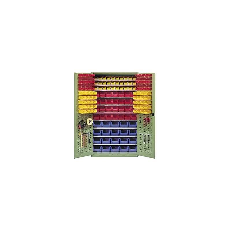 Armadio supercapiente, 10 ripiani, 158 cassettine, verde reseda RAL 6011. Fornitura = montato. Altezza = 1950 mm. Larghezza = 1100 mm. Profondità = 535 mm. Materiale = lamiera d'acciaio. Superficie = verniciatura a polvere. Portata totale = 500 kg. Numero ripiani = 10 pz. Materiale ripiani = lamiera d'acciaio, zincata. Portata per ripiano = 80 kg. Passo di regolazione altezza ripiani = 15 mm. Cassettine numero / lungh. x largh. x alt. = 20 x blu / 350x210x140 mm, 70 x giallo / 160x100x75 mm, 40 x rosso / 85x100x50 mm, 28 x rosso / 230x150x130 mm. Materiale cassettine modulari = polietilene. Colore corpo = verde reseda RAL 6011. Colore porta = verde reseda RAL 6011. Tipo di porta = anta a battente. Serratura = serratura a cilindro con maniglia girevole. Numero cassette = 158 pz. Peso = 183 kg. Dotazione interna porta = con pannelli forati per appendere cassettine e attrezzi. Dotazione ripiani = 3x300 / 7x250 mm di profondità. Cassettine estraibili singolarmente. Armadio in acciaio
