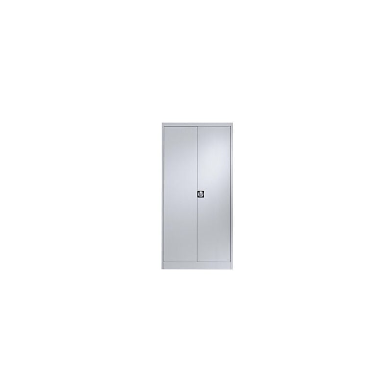 Armadio in acciaio con ante a battente, 4 ripiani, P 500 mm, alluminio brillante. Fornitura = montato. Larghezza = 950 mm. Altezza = 1950 mm. Profondità = 500 mm. Colore corpo = alluminio brillante RAL 9006. Materiale = lamiera d'acciaio, con verniciatura a forno. Tipo di prodotto = armadi con ante a battente. Tipo di porta = anta a battente. Colore porta = alluminio brillante RAL 9006. Numero ripiani = 4 pz. Colore ripiani = nero grafite RAL 9011. Portata per ripiano = 65 kg. Serratura = serratura di sicurezza a cilindro con nucleo sostituibile, 2 chiavi incluse. Dotazione interna = 4 ripiani. Passo di regolazione altezza ripiani = 35 mm. Altezza zoccolo = 100 mm. Angolo di apertura delle porte = 135 °. Spessore del corpo = 0.8 mm. Con ante a battente. Robusto corpo spesso 0,8 mm in lamiera d'acciaio saldata e riciclabile. Verniciatura a fuoco di qualità. Ripiani verniciati regolabili in altezza con passo di 35 mm. Portata ca. 65 kg per ripiano. Ante antisvergolamento con rinforzo