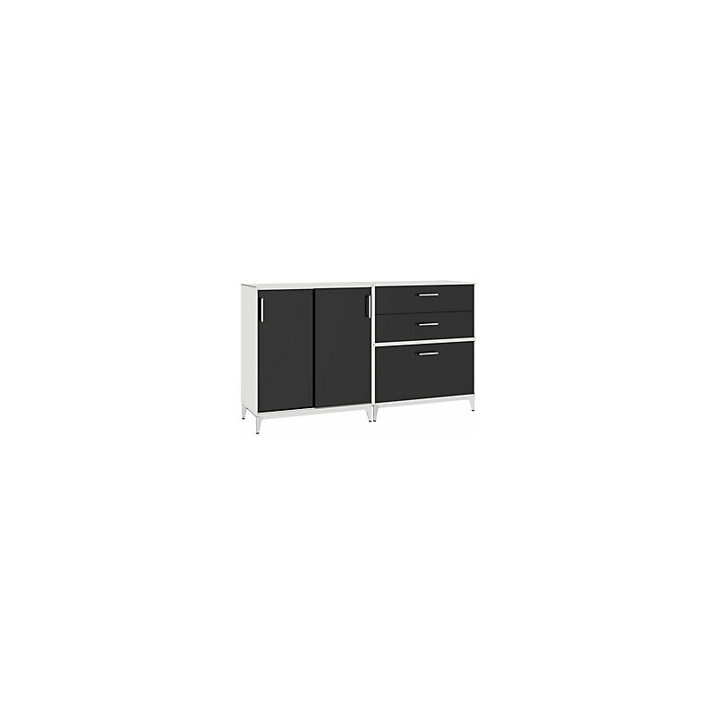 Mobile basso, ante scorrevoli, 3 cassetti, bianco segnaletico / nero notte. Fornitura = in parte smontato. Larghezza = 1540 mm. Altezza = 875 mm. Profondità = 385 mm. Colore corpo = bianco segnaletico RAL 9003. Materiale = acciaio. Tipo di prodotto = mobili bassi con ante scorrevoli. Tipo di porta = porta scorrevole. Colore porta = nero notte RAL 9005. Numero ante = 2 pz. Numero ripiani = 1 pz. Numero file raccoglitori = 2 pz. Ante scorrevoli dotate di guida a rulli e battuta ammortizzata. Cassetti dotati di rientro automatico e facilmente estraibili su guide nascoste. Realizzato in acciaio con verniciatura a polvere di alta qualità. element.x è un sistema di stoccaggio modulare estremamente innovativo per organizzare, mettere via e presentare. È un sistema molto versatile per la zona living, la casa o l'ufficio. Listelli angolari cromati per un design ricco di eleganza. La combinazione di mobiletto basso con ante scorrevoli e cassetto singolo e doppio su piedini cromati lucidi! Le