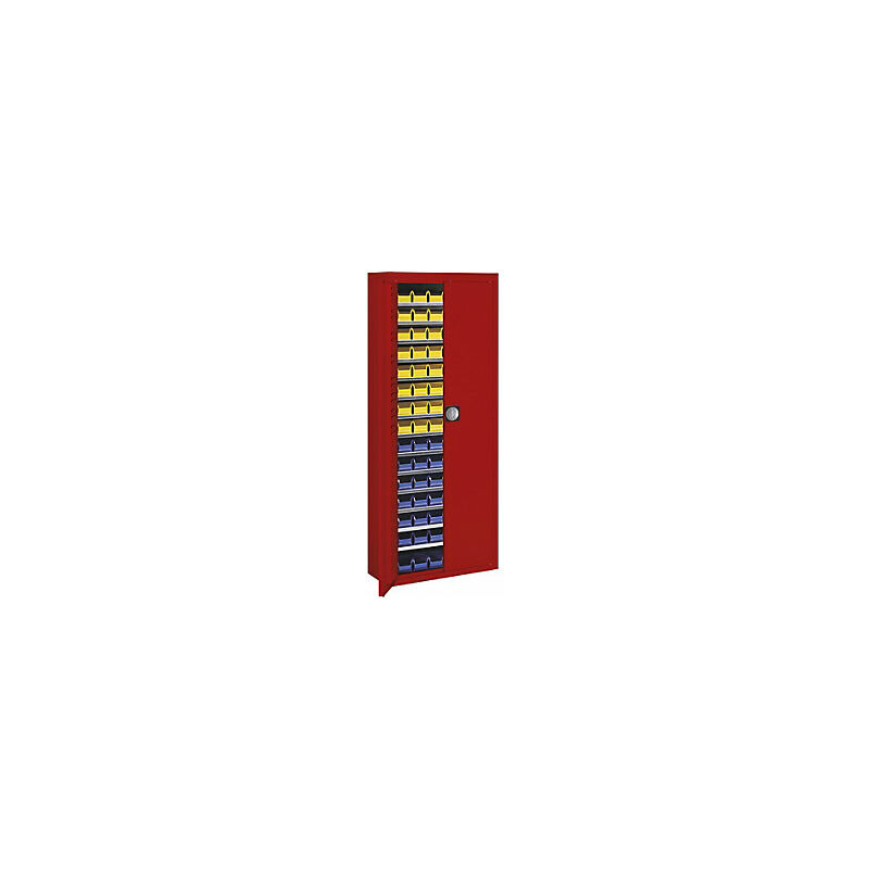 Armadio magazzino con cassette, alt. x largh. x prof. 1740 x 680 x 280 mm, tinta unita, rosso, 90 cassettine. Fornitura = montato. Altezza = 1740 mm. Larghezza = 680 mm. Profondità = 280 mm. Struttura = saldata. Materiale = lamiera d'acciaio. Superficie = verniciatura a polvere. Portata totale = 250 kg. Numero ripiani = 14 pz. Materiale ripiani = lamiera d'acciaio, zincata. Portata per ripiano = 50 kg. Passo di regolazione altezza ripiani = 17.5 mm. Cassettine numero / lungh. x largh. x alt. = 45 x blu / 160x100x75 mm, 45 x giallo / 160x100x75 mm. Materiale cassettine modulari = polietilene. Colore corpo = rosso fuoco RAL 3000. Colore porta = rosso fuoco RAL 3000. Tipo di porta = anta a battente. Angolo di apertura delle porte = 135 °. Serratura = chiusura a triplo chiavistello con serratura di sicurezza a cilindro con nucleo sostituibile. Numero cassette = 90 pz. Peso = 66 kg. Per attrezzi e minuteria in officina, magazzino e azienda. Sfruttamento ottimale dello spazio mediante