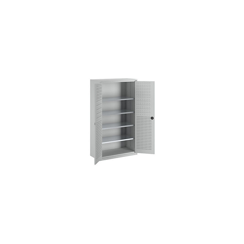 Armadio supercapiente, 4 ripiani, grigio chiaro RAL 7035. Fornitura = montato. Altezza = 1950 mm. Larghezza = 1100 mm. Profondità = 535 mm. Materiale = lamiera d'acciaio. Superficie = verniciatura a polvere. Portata totale = 500 kg. Numero ripiani = 4 pz. Materiale ripiani = lamiera d'acciaio, zincata. Portata per ripiano = 80 kg. Passo di regolazione altezza ripiani = 15 mm. Colore corpo = grigio chiaro RAL 7035. Colore porta = grigio chiaro RAL 7035. Tipo di porta = anta a battente. Serratura = serratura a cilindro con maniglia girevole. Peso = 149 kg. Dotazione interna porta = con pannelli forati per appendere cassettine e attrezzi. Dotazione ripiani = 4x495 mm di profondità. Elevata capienza. Armadio in acciaio stabile e robusto. Verniciatura a polvere antiabrasione ed ecologica. Sfruttamento ottimale dello spazio. Corpo in lamiera d'acciaio. Ante con pannello forato interno per appendere cassettine e supporti per attrezzi. Chiusura incassata con maniglia girevole a triplo