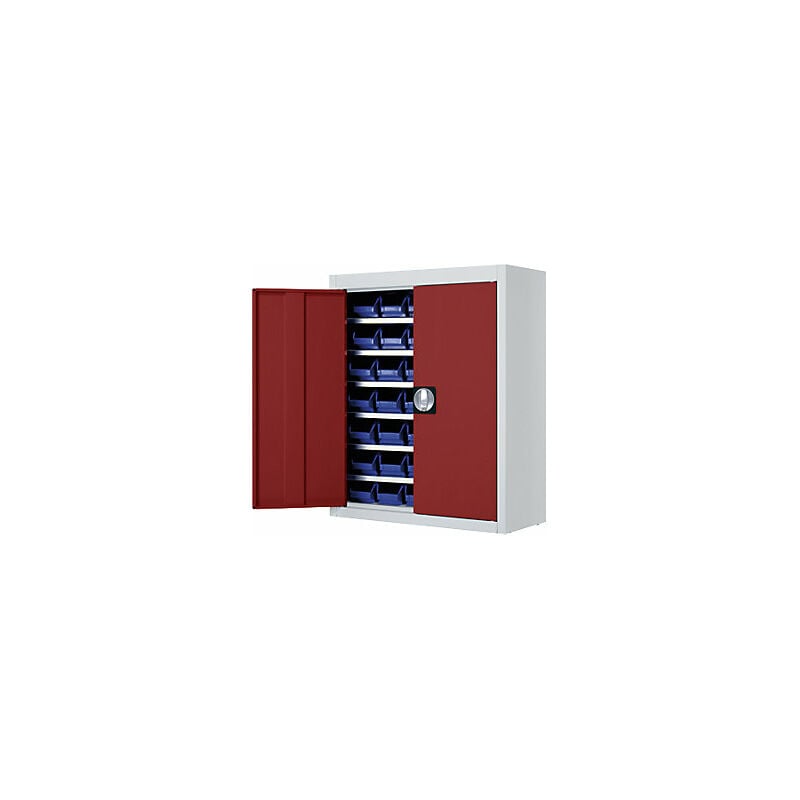 Armadio magazzino con cassette, alt. x largh. x prof. 820 x 680 x 280 mm, in due colori, corpo grigio, ante rosse, 42 cassettine. Fornitura = montato. Altezza = 820 mm. Larghezza = 680 mm. Profondità = 280 mm. Struttura = saldata. Materiale = lamiera d'acciaio. Superficie = verniciatura a polvere. Portata totale = 250 kg. Numero ripiani = 6 pz. Materiale ripiani = lamiera d'acciaio, zincata. Portata per ripiano = 50 kg. Passo di regolazione altezza ripiani = 17.5 mm. Cassettine numero / lungh. x largh. x alt. = 42 x blu / 160x100x75 mm. Materiale cassettine modulari = polietilene. Colore corpo = grigio chiaro RAL 7035. Colore porta = rosso fuoco RAL 3000. Tipo di porta = anta a battente. Angolo di apertura delle porte = 135 °. Serratura = chiusura a triplo chiavistello con serratura di sicurezza a cilindro con nucleo sostituibile. Numero cassette = 42 pz. Peso = 32 kg. Per attrezzi e minuteria in officina, magazzino e azienda. Sfruttamento ottimale dello spazio mediante suddivisione