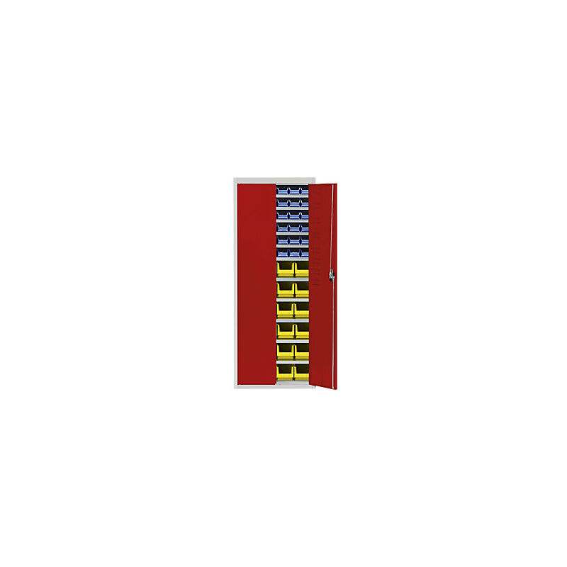 Armadio magazzino con cassette, alt. x largh. x prof. 1740 x 680 x 280 mm, in due colori, corpo grigio, ante rosse, 60 cassettine. Fornitura = montato. Altezza = 1740 mm. Larghezza = 680 mm. Profondità = 280 mm. Struttura = saldata. Materiale = lamiera d'acciaio. Superficie = verniciatura a polvere. Portata totale = 250 kg. Numero ripiani = 11 pz. Materiale ripiani = lamiera d'acciaio, zincata. Portata per ripiano = 50 kg. Passo di regolazione altezza ripiani = 17.5 mm. Cassettine numero / lungh. x largh. x alt. = 36 x blu / 160x100x75 mm, 24 x giallo / 230x150x130 mm. Materiale cassettine modulari = polietilene. Colore corpo = grigio chiaro RAL 7035. Colore porta = rosso fuoco RAL 3000. Tipo di porta = anta a battente. Angolo di apertura delle porte = 135 °. Serratura = chiusura a triplo chiavistello con serratura di sicurezza a cilindro con nucleo sostituibile. Numero cassette = 60 pz. Peso = 63 kg. Per attrezzi e minuteria in officina, magazzino e azienda. Sfruttamento ottimale