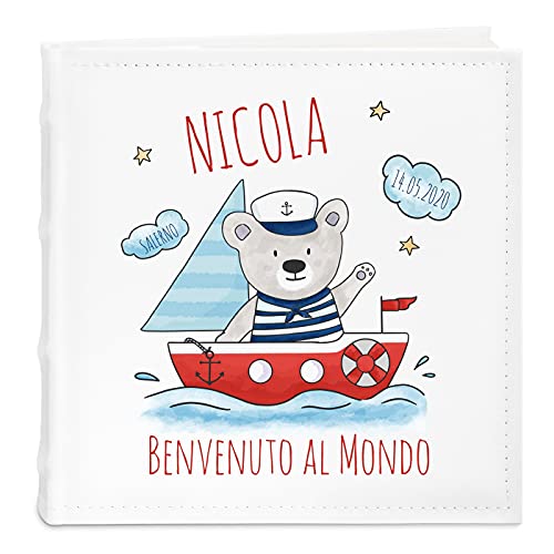 Maverton Album Fotografico - Copertina in Pelle Sintetica Bianca Personalizzata con Stampa Colorata - 100 pagine - 200 foto 10x15 cm - regali neonato, battesimo, compleanno - Barchetta