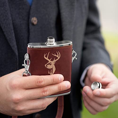 Maverton Fiaschetta in metallo rivestita in pelle - in acciaio con tre bicchierini - dimensioni 15cm x 9,5cm x 3cm - incisione personalizzata - perfetta idea regalo per uomo - cervo