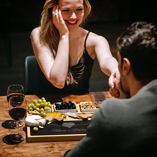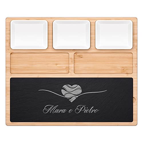 Maverton Tagliere per formaggio e salumi - rettangolare - piatto da formaggio - in ardesia e bambù - incisione personalizzata - set 3 posate - pensiero speciale anniversario - amore