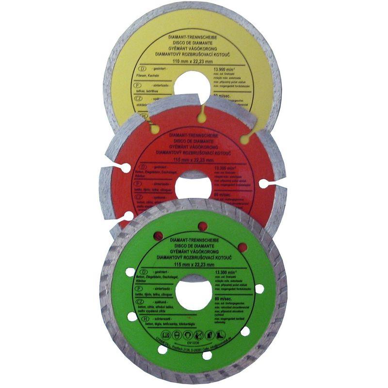 1x Ø 110 mm. per le piastrelle, lastre di pietra naturale, 1x Ø 115 mm. segmentato per cemento, mattoni, clinker, 1x Ø 115 mm. per calcestruzzo, mattoni, tegole, clinker