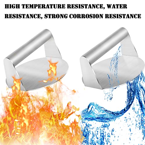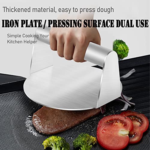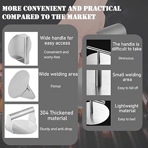 【Strumento di pressa per hamburger: la pressa per hamburger è realizzata in acciaio inossidabile per uso alimentare, con manico. È resistente alle alte temperature e a bassa trasmissione di calore, quindi non devi preoccuparti di scottature. È adatto per la preparazione di hamburger, panini, salumi, prosciutto e molto altro ancora.