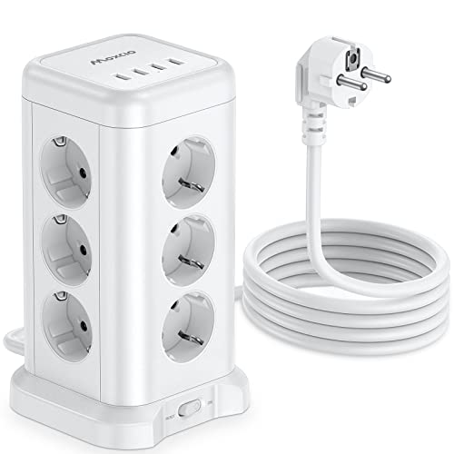 Maxcio Ciabatta Multipresa Verticale(4000W/16A), Multipresa Torretta con 12 Presa e 4 Porte USB, 1 Interruttore, Presa Multipla con Protezione da Sovratensione per Casa e Ufficio, 2M Cavo, Bianco