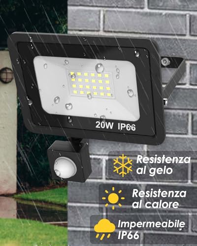 Maxesla Faro LED Esterno con Sensore Movimento 20W, 2000LM Faretto LED Esterno con Sensore,Impermeabile IP66 Faretti LED Esterno con Sensore di Movimento,6000K Luce con Sensore di Movimento da Esterno