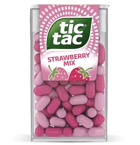 Tic Tac Strawberry Mix: Il gusto della fragola si fonde alla vaniglia e alla menta in un mix colorato dolce e dissetante! Il lato dolce è il confetto rosa chiaro: la fragola vanigliata. Il lato dissetante è il confetto rosa scuro: la fragola mentolata.