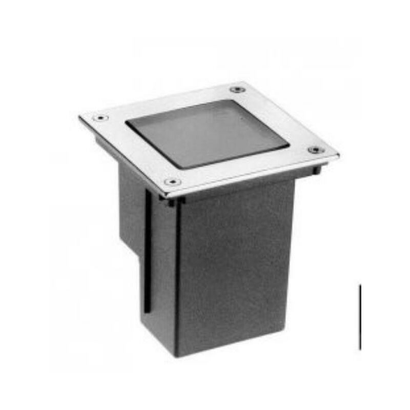Faro da incasso a pavimento per esterni, con borchia esterna quadrata in acciaio inox e vetro trasparente. grado di protezione ip67;