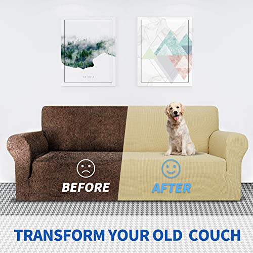 MAXIJIN Fodera per divano super elasticizzata per 3 posti, 1 pezzo Fodera per divano jacquard Protezione per mobili Cani Pet Friendly Fodera per divano aderente (3 posto, Beige)