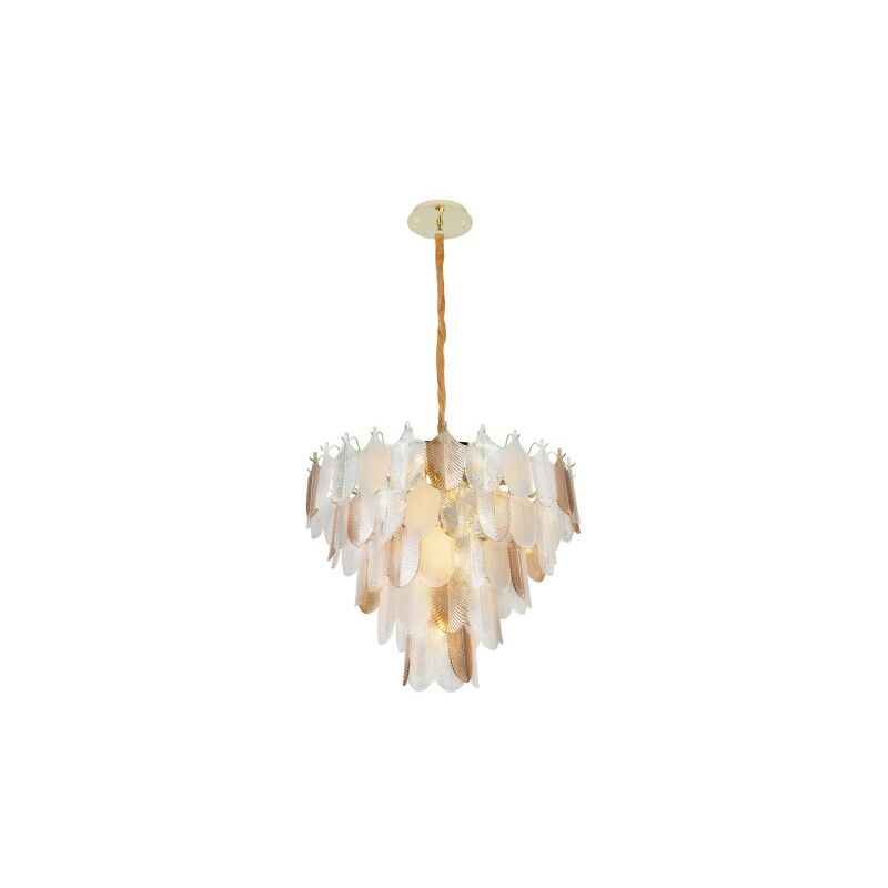 Potenza: 15 x 40W E14 230VH: 150 cm, Ø 80 cm, h: 60 cmFinitura dettagli: oroMateriale: metallo, vetro, tessuto/metallo, vetro, tessutoNon contiene lampadine/lampadine escluse