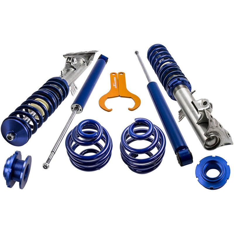 Notice:No Top Mount Included,Modification Required If You Use OE Top Mount For BMW 3 Series E36 Coupe / Saloon / Touring 1990-1999 Coilover Suspension Application: For BMW 3 E36 4-door sedan 316i,318i,320i,323i,325i,328i,318is,325is,318tds,325tds,325td 09/1990-12/1998 For BMW 3 E36 2-door coupe 318is,316i,320i,323i,325i,328i 09/1991-04/1999 For BMW 3 Convertible E36 318i,320i,323i,325i,328i 03/1993-04/1999 For BMW 3 Touring E36 5-door wagon 316i,318i,320i,323i,328i,318tds,325tds 08/1994-12/1999 Quantity: springs and shocks for front and rear, no top mounts included a pair wrench for height adjustment Top mounts: front and rear OE top mounts required Damping: not available Spring rate Front: 8 kg/mm (448 lbs/in) Spring rate Rear: 10 kg/mm (560 lbs/in) Spring length Front: 170mm Spring length Rear: 190mm Adjustable height: lowering 35mm-75mm Coilover overall length Front: 445mm-585mm Coilover overall length Rear: 455mm-655mm Shock type: Twin tube Color: blue Warranty: 24 months warranty
