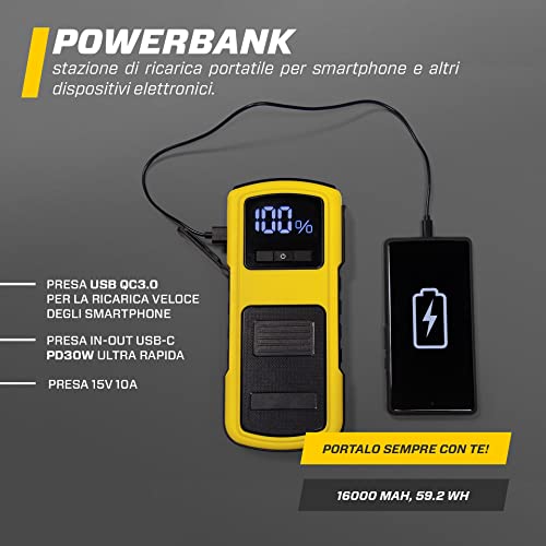 la sua capacità di 16000 mAh, 59.2 Wh, consente di avviare diversi veicoli con batteria scarica prima che sia necessario ricaricarla;