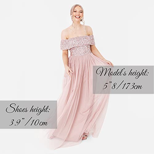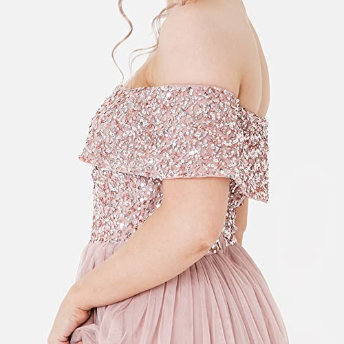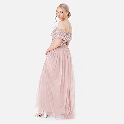 Maya Deluxe Maya Frosted Pink Bardot Embellished Maxi Dress Vestito per Damigella d'Onore, Rosa Satinato, 28 Donna