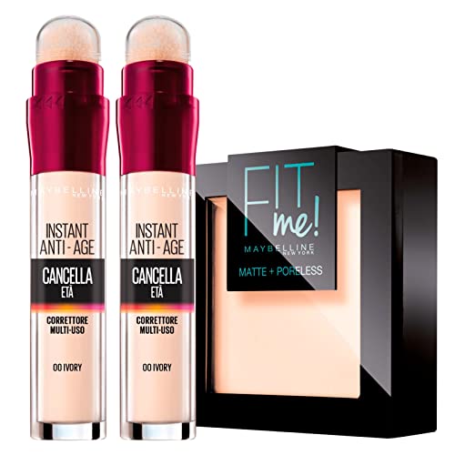 Il kit è composto da: 1x Maybelline New York Fit Me Matte & Poreless Cipria Opacizzante Colore 104 Soft Ivory e 2x Il Cancella Età Correttore Liquido Multiuso Colore 00 Ivory
