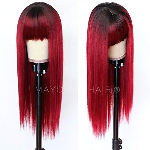 Maycaur Red Color Synthetic Hair Wigs with Full Bangs Black Red Ombre Color Long Straight Women's Wig Heat Resistant Synthetic No Lace Wigs for Fashion Women