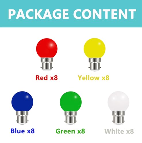 Lampadine colorate B22 confezione da 40. I colori includono: rosso, giallo, blu, verde, bianca.