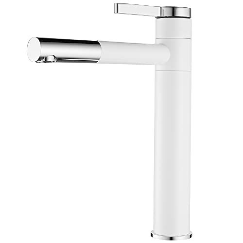 Maynosi Rubinetti per lavandini bagno, Rubinetto per Lavabo Alto con Bocca Girevole a 360°, Monocomando per Lavandino Bagno con tubi flessibili da 50 cm, Moderno Stile Conciso, Ottone (Bianco)