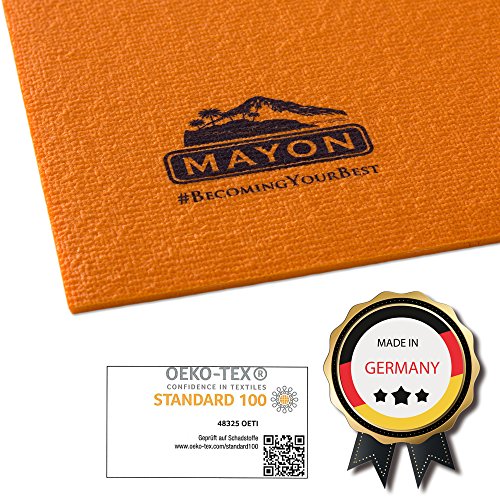 Mayon, tappetino premium da yoga, antiscivolo, ecologico e privo di sostanze nocive secondo gli standard Öko Tex 100, 183 x 60 x 0,45 cm, in PVC e tessuto di fibre di vetro, lavabile in lavatrice fino a 60° C, prodotto in Germania, Orange, L: 183cm x B: 60cm x H: 0,45cm