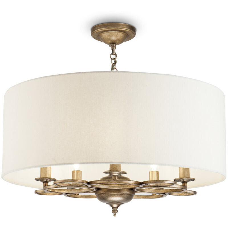 Collezione Anna ELEGANZA SENZA TEMPO Lampadario da uno stile contemporaneo della serie Anna, con una struttura in metallo colore oro antico composto da 5 luci, con diffusore in PVC colore crema.. È una soluzione di illuminazione elegante e raffinata, ideale per arredare con stile qualsiasi ambiente moderno. Realizzato in metallo oro antico, questo lampadario presenta una struttura a forma di anelli che si fondono tra loro in modo armonioso, creando un effetto visivo d'effetto. Il paralume in tessuto panna applicato su PVC è un elemento di grande importanza estetica del lampadario, che dona alla luce emessa una tonalità calda e morbida, perfetta per creare un'atmosfera accogliente e rilassante. La combinazione tra il metallo oro antico e il tessuto panna è particolarmente elegante e raffinata, donando una personalità unica e inconfondibile. La struttura e il decoro della composizione a forma di anelli di metallo sono stati studiati per garantire una perfetta diffusione della luce