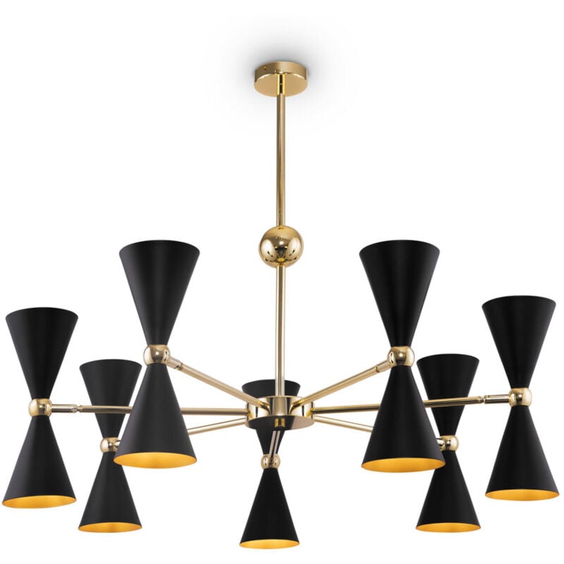Collezione Vesper STILE CONTEMPORANEO IN STRUTTURA METALLICA Il lampadario è realizzato con una solida struttura in metallo nero, con dettagli in oro che aggiungono un tocco di eleganza. . Le plafoniere sono verniciate all'interno con un colore ottone caldo, che crea un'illuminazione morbida e accogliente. Il meccanismo e le luci sono girevoli, permettendo di regolare l'illuminazione in modo preciso e personalizzato. Con 14 luci, questo lampadario è perfetto per illuminare grandi spazi, come sale da pranzo o sale conferenze, e il design contemporaneo lo rende adatto a qualsiasi ambiente moderno.