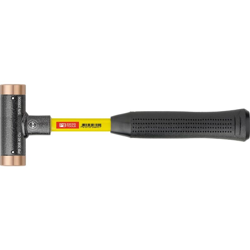 Robusta parte centrale in acciaio con cono di supporto e sede per tasselli. Tasselli in rame. Con manico quasi infrangibile in fibra di vetro SUPERGLAS, impugnatura in plastica nera. Antirimbalzo grazie ai pesi presenti nel corpo del martello. Al momento dell'impatto i pesi vengono spinti verso il basso e assorbono il contraccolpo. Uso: Per colpi precisi e intensi o per un colpo delicato nei lavori di montaggio. Ricambi: Per i tasselli di ricambio vedi n. art. 754760. Dati tecnici Antirimbalzo sì Tipo di prodotto Martello Lunghezza manico, mm 335 Materiale manico Fibra di vetro Serie PB 308 Cu Materiale corpo Acciaio Lunghezza complessiva, mm 380 Materiale inserto Rame ⌀ Testa della mazza, mm 40 Lunghezza testa con tasselli, mm 121 Peso, kg 1,38