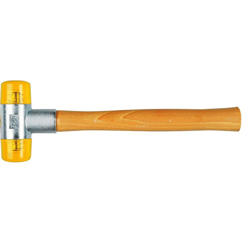 Robusto fulcro centrale in presso-getto di zinco con collarino di rinforzo salvamanico e tasselli antiurto. Con manico per martelli bordato. Con tasselli resistenti agli urti in cellidor (gialli). Uso: Per la spianatura o l'applicazione di pezzi sui banchi macchina e per colpi morbidi nei lavori di montaggio. Ricambi: Inserto di ricambio in cellidor: vedi n. art. 754600;