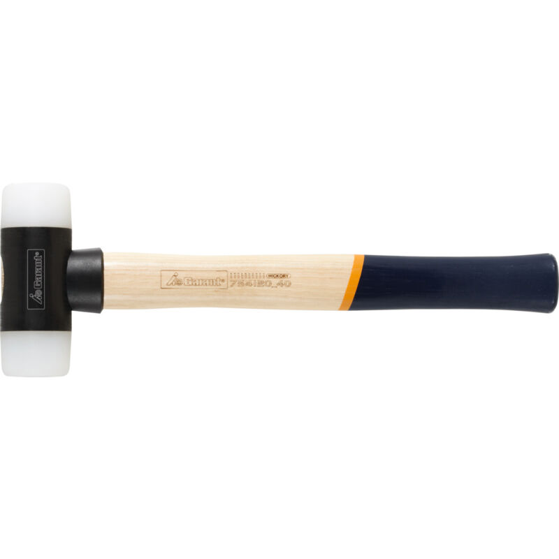 Robusta parte centrale in metallo con manico in noce americano, forma bordata con collarino di rinforzo in nylon e cuneo di sicurezza. I tasselli in nylon, resistenti agli urti e all'usura, sono uniti alla parte centrale mediante un sistema di fissaggio a doppia azione. Parte centrale in acciaio. Uso: Per la spianatura o l'applicazione di pezzi sui banchi macchina e per colpi morbidi nei lavori di montaggio. Ricambi: Tassello di ricambio in nylon e manico di ricambio disponibili rispettivamente ai n. art. 754180 e 751650. Dati tecnici Tipo di prodotto Martello Lunghezza manico, mm 280 ⌀ Testa della mazza, mm 22 Lunghezza testa con tasselli, mm 73 Peso, kg 0,188