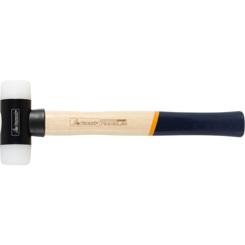 Robusta parte centrale in metallo con manico in noce americano, forma bordata con collarino di rinforzo in nylon e cuneo di sicurezza. I tasselli in nylon, resistenti agli urti e all'usura, sono uniti alla parte centrale mediante un sistema di fissaggio a doppia azione. Parte centrale in alluminio, nero anodizzato. Vantaggi: Parte centrale in alluminio = notevole riduzione del peso. Questo permette di lavorare con grande precisione evitando contemporaneamente di affaticare il polso. Uso: Per la spianatura o l'applicazione di pezzi sui banchi macchina e per colpi morbidi nei lavori di montaggio. Ricambi: Tassello di ricambio in nylon e manico di ricambio disponibili rispettivamente ai n. art. 754180 e 751650. Dati tecnici Tipo di prodotto Martello Lunghezza manico, mm 300 ⌀ Testa della mazza, mm 27 Lunghezza testa con tasselli, mm 81 Peso, kg 0,2
