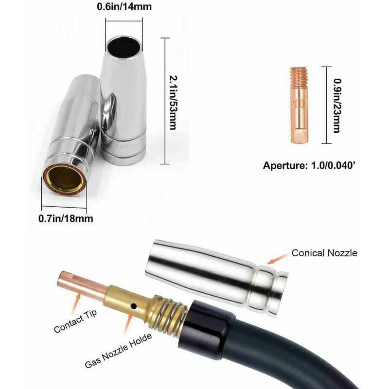 usura del bruciatore, nessuna speciale strumenti richiesti. Facile, conveniente e veloce Il materiale in rame ha una buona conduttività termica ed elettrica, resistenza alle alte temperature più stabile e resistenza alla corrosione, robusto con una lunga durata < /p> Dimensione: 1,0 mm Accessori di saldatura premium per torcia per saldatura MIG MAG AK15/MB15 42 pezzi. 2 ugelli gas e 40 punte di contatto in diverse dimensioni 1,0 mm Adatto a tutti i dispositivi MIG MAG con torcia < p>AK15/ MB15 di altri produttori Facile montaggio delle parti soggette ad usura sul bruciatore, non sono necessari attrezzi speciali