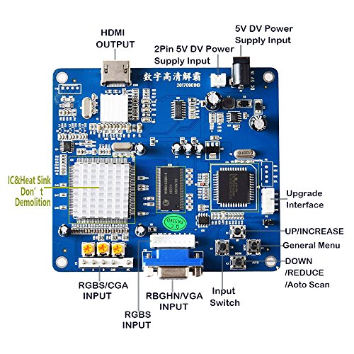 Supports RGBS/CGA/RGBHV/EGA/VGA signal input. Supports HDMI output 640*480,800*600,1024*768,1360*768.