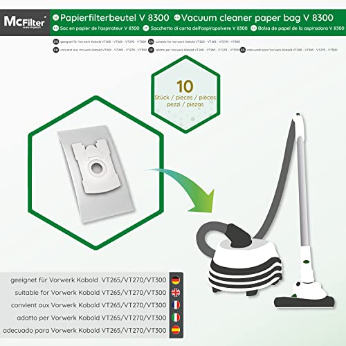 McFilter | 10 Sacchetti per aspirapolvere adatti per aspirapolvere Vorwerk Folletto VT265, VT270, VT300, sacchetto a 5 strati in tessuto non tessuto, tipo V 8300