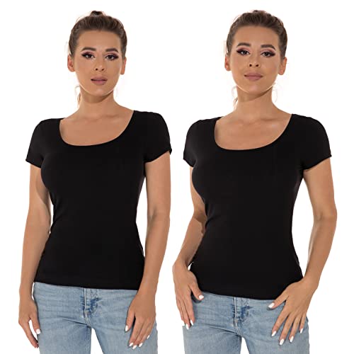 Mcilia T-Shirt Girocollo Elasticizzata T-Shirt Morbida Tinta Unita, Confezione da 2 Nero M