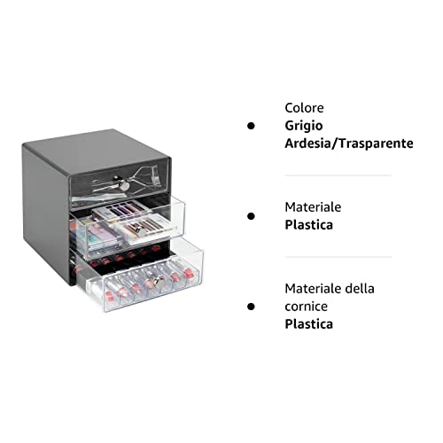 MDesign Cassettiera in plastica resistente - Mini cassettiera per cosmetici con tre scomparti - Elegante porta cancelleria con manici cromati - grigio ardesia/trasparente