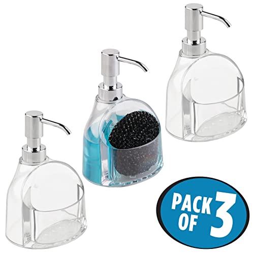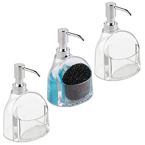 MDesign Set da 3 Dispenser sapone - Portasapone liquido con porta spugna e spugnetta cucina - Erogatore in plastica - trasparente e argentato