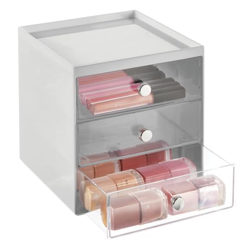 MDesign Porta trucchi in plastica con 3 cassetti - Cassettiera plastica ideale per trucchi e cosmetici - Pratico organizer trucchi impilabile per bagno, camera, ufficio - grigio e trasparente
