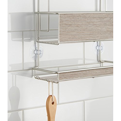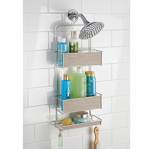 MDesign Scaffale da appendere in doccia - Organizer doccia con tre scompartimenti e appendini da appendere al soffione doccia - Portaoggetti per doccia senza forare il muro - Argento e legno grigio
