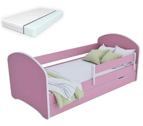 Meblex | Letto per bambini con cassetti e materasso in schiuma, 160x80cm, per cameretta, con struttura in MDF e testiera integrata, Legno strutturale, Rosa, 160x80cm
