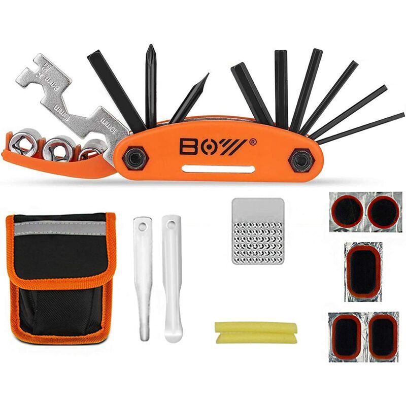 Attrezzo per bici 16 in 1 perfetto per gli spostamenti: il kit di attrezzi per bici è la scelta migliore. Nonostante le sue dimensioni compatte, il multitool per bici ha più di 16 funzioni di cui potresti aver bisogno in movimento. Contiene chiave a brugola da 2/2,5/3/4/5/6 mm (chiave a brugola), cacciavite Phillips, cacciavite a lama piatta, chiave per raggi: 14 G (3,4 mm), asta filettata n. 39;