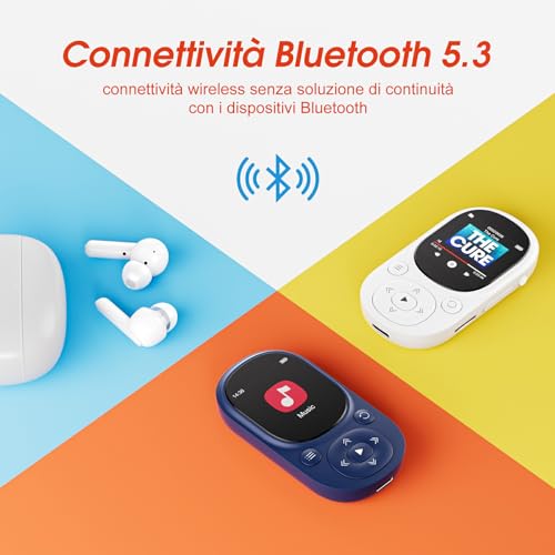 Trasmissione Bluetooth 5.3: Questo lettore MP3 può essere abbinato a cuffie e altoparlanti wireless. Tuttavia, non è dotato di ricezione Bluetooth, quindi non può essere abbinato a dispositivi come telefoni e computer portatili.