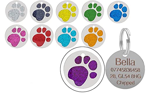 JK - Medaglietta per cani e gatti con stampa di zampe, personalizzabile con incisione, taglia S/L (25 mm, standard, colore: viola)